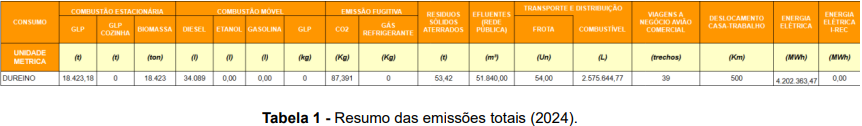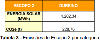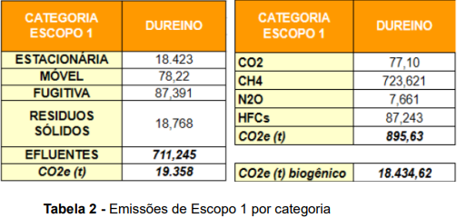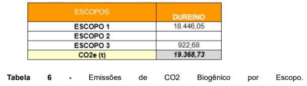 As emissões da Dureino no Escopo 1, oriundas da queima de etanol puro e da fração renovável presente na gasolina utilizada pela frota de veículos leves,